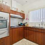 The adjacent kitchen is graced by low-maintenance flooring, wooden cabinetry, tiled splashbacks, double sinks, a water-filter tap, a Robinhood range hood, a Westinghouse stainless-steel gas cooktop and a separate stainless-steel oven/grill of the same brand. It also benefits from a pleasant leafy vista to Perth’s rolling hills, as well as lots of natural sunlight filtering in during the morning.