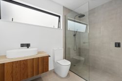The main house features three spacious bedrooms, including a luxurious master suite with a walk-in wardrobe and a tiled ensuite. The stylishly appointed kitchen, complete with concrete benchtops, timber cabinetry, and a butler’s pantry, flows seamlessly into the open-plan living area, which is warmed by a ducted heat pump and a sophisticated Stûv fireplace. The bathrooms are finished with elegant tiled walk-in showers, adding a touch of modern luxury, while engineered timber floors provide both beauty and durability throughout the home. A double garage and off-street parking add to the property’s practicality.