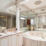 Inside, the interiors are as impressive as the façade. A sweeping staircase with ornate wrought-iron balustrades and a sparkling chandelier set the tone for classical refinement. Expansive living zones flow through a series of arched openings with decorative columns, while crystal chandeliers, ornate cornices, and full-length drapery add to the home’s European sophistication. Formal and informal living areas, a grand dining space, and a music room with piano setting provide multiple options for both entertaining and relaxed family life. Perfect for large-scale entertaining, the open-plan kitchen, meals, and family area flow seamlessly onto a spacious alfresco terrace overlooking private garden surrounds.