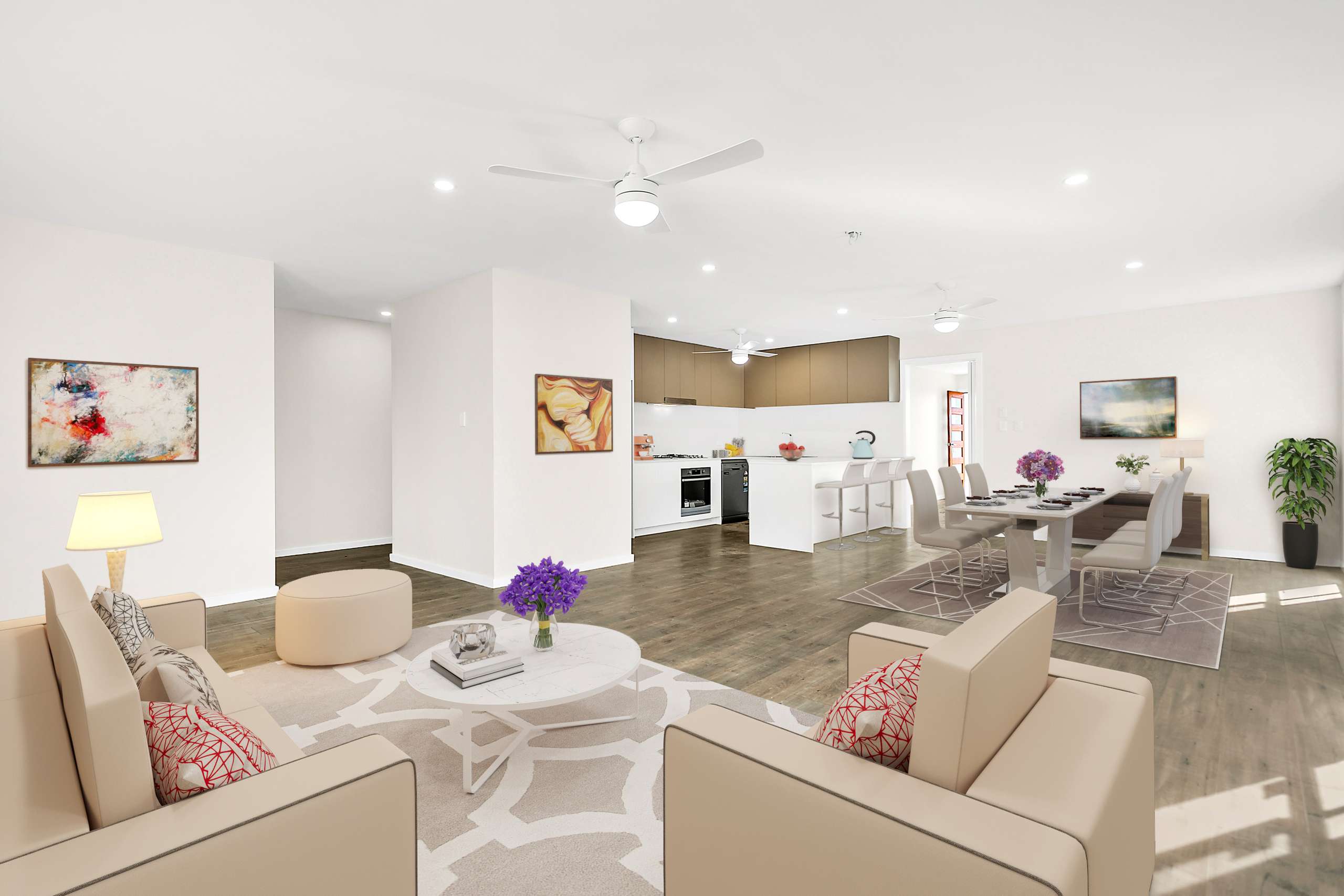Open plan living and dining space flooded with natural light