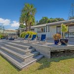 The large , fully fenced backyard provides plenty of space for family and guests, with three garden sheds for storage and the bonus of a hot and cold outdoor shower – ideal after a swim or day on the water.