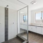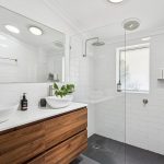 The recently renovated bathroom introduces a modern touch with a floating double vanity, stone tops, floor-to-ceiling classic white subway tiles, and an open walk-in shower — the perfect blend of style and function.