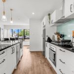 The modern kitchen is well-appointed with gas hobs, and more than enough room for all the essentials. It’s a sunny and functional space with a lovely outlook and a layout that keeps you connected to the living area.