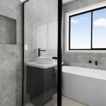 • Modern main bathroom with walk in shower with tempered glass panel, wall-hung vanity and separate WC