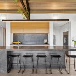 A gallery-style entrance hallway leads to the heart of the home—a light-filled living room with exposed rafters, high-pitched gable roof, and a feature window framing breathtaking views of Mt. Roy. The cedar timber ceiling seamlessly continues to the exterior, enhancing the home’s connection to its surroundings.
